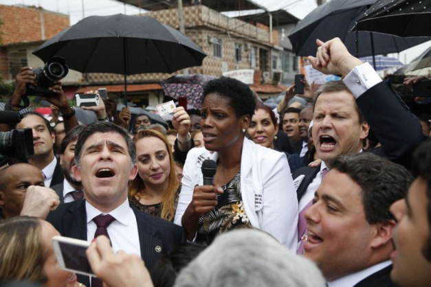 A advogada Valéria Lúcia dos Santos foi o centro das atenções de um ato de desagravo, em frente ao Fórum de Duque de Caxias, que contou com dezenas de pessoas, inclusive o presidente nacional da Ordem dos Advogados do Brasil (OAB), Cláudio Lamachia. Valéria, que é negra, foi detida e algemada no último dia 10, dentro do fórum, durante uma audiência, a pedido de uma juíza leiga. A cena foi gravada e causou indignação por todo o país. A manifestação atraiu advogados e militantes defensores das causas raciais e dos direitos das mulheres, na tarde desta segunda-feira (17). Embora o ato tenha sido pacífico desde o início, o fórum teve as portas fechadas, o que deixou os advogados ainda mais inconformados.