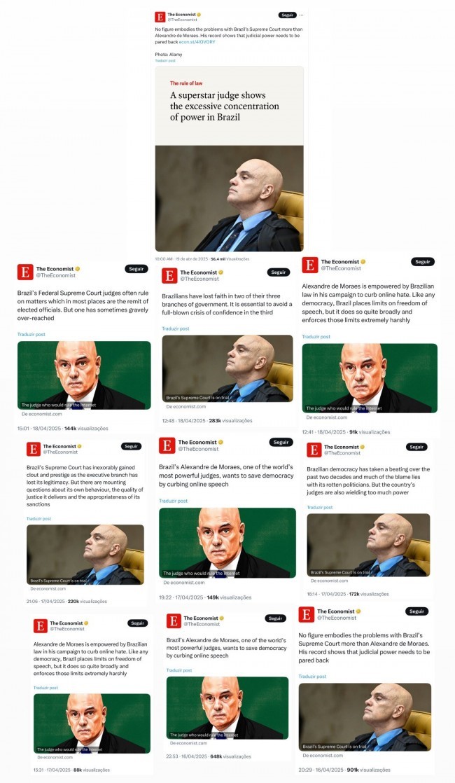 Nas últimas 48 horas o perfil oficial da respeitada Revista britânica The Economist disparou uma infinidade de ‘tuítes’ relacionados a dura matéria que publicou sobre o ministro Alexandre de Moraes. A publicidade que a própria revista está dando ao caso é algo incomum. Com isso o tom sinistro dado ao ministro vai ganhando o mundo e colocando o Supremo Tribunal Federal do Brasil numa posição extremamente delicada.