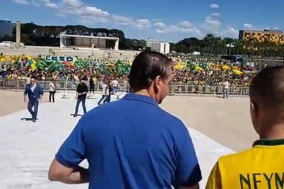 Sem máscara e acompanhado da filha Laura, de 09 anos, Bolsonaro desceu a rampa do Planalto e cumprimentou apoiadores de longe, porém permitiu que alguns manifestantes ultrapassassem a barreira de segurança para cumprimentá-lo.