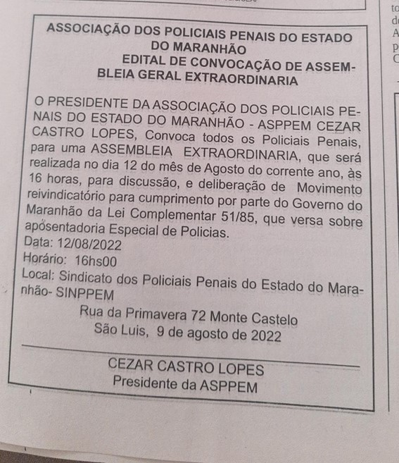 Os Policiais Penais integrante da Associação dos Policiais Penais do Maranhão realizarão amanhã (12) uma Assembleia Geral, na sede do Sinppem à rua da Primavera, 72, no bairro do Monte Castelo, quando começarão a decidir os rumos de um novo movimento pela reivindicação da aposentadoria especial dos Policiais Penais do Maranhão.