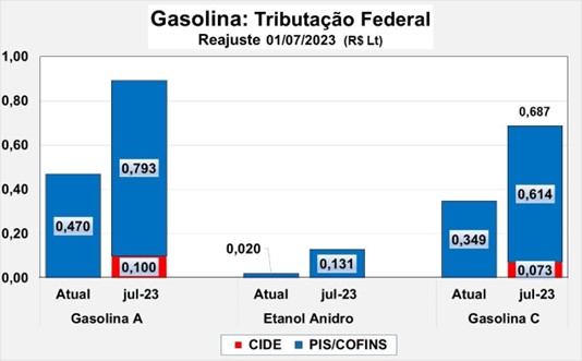 Segundo a Abicom, os encargos terão impacto total de aproximadamente R$ 0,68 no litro de gasolina. Serão R$ 0,07 de Cide (Contribuição de Intervenção no Domínio Econômico) e R$ 0,61 de Pis/Cofins (Programa de Integração Social e Contribuição para Financiamento da Seguridade Social). Sobre o etanol, o crescimento de cobrança tributária diz respeito apenas a Pis/Cofins.