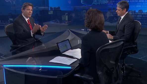Último presidenciável a ser entrevistado no Jornal Nacional, da TV Globo, o candidato do PT à Presidência da República, Fernando Haddad, foi interrompido 62 vezes em 27 minutos. Em comunicado distribuído pelo PT neste sábado (15), a postura dos entrevistadores é classificada como “tendenciosa”.