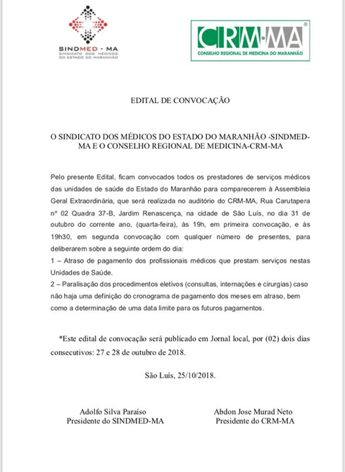 O Sindicato dos Médicos do Maranhão e o Conselho Regional de Medicina do Estado realizarão assembleia geral conjunta na próxima quarta-feira (31), para tomar uma posição sobre os atrasos nos pagamentos de salários de grande parte dos profissionais que prestam serviços em hospitais e postos de saúde da capital e do interior. Várias tentativas já foram feitas no sentido de que sejam feitos os pagamentos devidos, mas infelizmente a Secretaria de Estado da Saúde e os seus prepostos administradores das unidades, tratam o problema com certa indiferença, daí a iniciativa da assembleia geral conjunta entre a entidade de classe e o CRM para uma posição clara e objetiva para o sério e grave problema, registraram os médicos Adolfo Paraiso, presidente do SINDMED-MA e Abdon Murad Neto, presidente do CRM-MA. Diante das denuncias de corrupção com desvios de recursos públicos e as inúmeras facilidades politicas dentro do Sistema de Saúde, os médicos entendem que estão sendo discriminados e altamente desrespeitados em seus direitos.