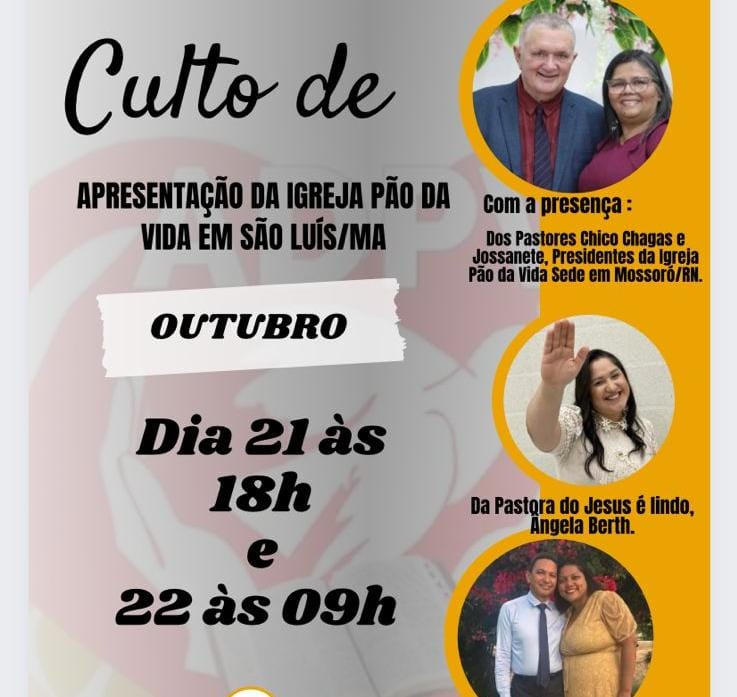 É com esse espírito de fazer o “Ide de Jesus”, que o Ministério Pão da Vida está chegando em nossa cidade. Para tanto, faremos dois cultos de apresentação da Igreja, nos dias 21, às 18h, e 22 de outubro, às 9h, no auditório do Centro Pedagógico Paulo Freire da UFMA, localizado no Campus do Bacanga, o qual contará com a presença dos Pastores Presidentes, Chico Chagas e Jossanete Silva.