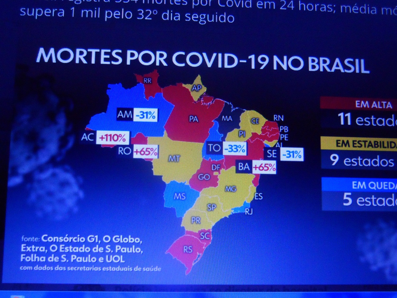 A verdade é que a pandemia tem crescido de maneira bem acentuada no Estado, inclusive com a ocupação de leitos superando os mais de 90% nas ocupações, e as preocupações do Governo do Estado podem ser vistas bem claramente com a falta de informação a Rede Globo para o mapa nacional da covid-19.