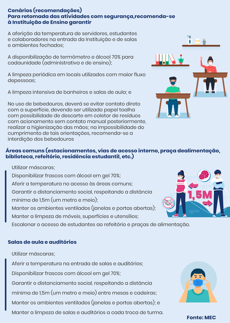 As recomendações valem para espaços como salas de aulas, laboratórios e demais áreas comuns e estabelecem distanciamento de 1,5 metros entre mesas e cadeiras e a medição da temperatura de alunos, professores e funcionários. O MEC oriente que as instituições de ensino dispensem todos os estudantes e servidores que fazem parte dos grupos de risco do novo coronavírus, como pessoas com diabetes ou hipertensão. Outro cuidado a ser tomado é o reforço de limpeza de superfícies nesses locais, como corrimãos, bebedouros e catracas. Ao mesmo tempo, nos casos que forem possíveis, a prioridade é adotar aulas virtuais.