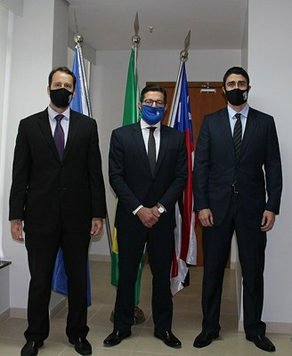 O Procurador-chefe do MPF/MA, José Leite, recebeu os delegados Renato Madsen e Júlio Sombra em seu gabinete, na sede da Procuradoria da República no Maranhão. Da esquerda para a direita: novo Superintendente da Polícia Federal, Renato Madsen, Procurador-chefe José Leite Filho e Delegado Julio Sombra.