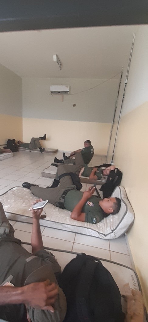 03. Servidores do turno da noite da Penitenciária Regional de Timon são obrigados a jantar sentados em redes ou no chão, pois na parte da noite não tem em seu alojamento sequer uma mesa e cadeiras para possam jantar, são obrigados a improvisar redes armadas com cadeira. Se existe geladeira, panelas e fogão, estes foram doados e comprados pelos próprios servidores através de “vaquinhas” até mesmo rádios comunicadores os servidores tem que comprar de seu próprio dinheiro!
