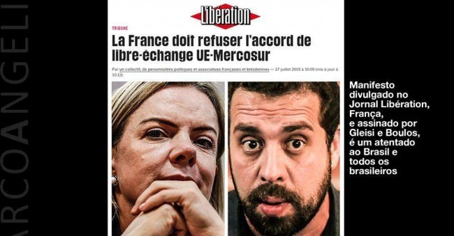 Publicado no jornal francês de esquerda Libération em 27 de julho passado, o manifesto assinado por Gleisi Hofmann (PT), Boulos (PSOL), Glauber Braga (PSOL), Humberto Costa (PT), Wagner Freitas (CUT), Davi Miranda (que se auto intitula membro da comissão das relações internacionais e defesa nacional do Brasil), Taliria Petrone (PSOL), Paulo Pimenta (PT) e João Pedro Stédile (MST), ao lado de outros comunistas franceses, é literalmente um ato de traição ao Brasil.