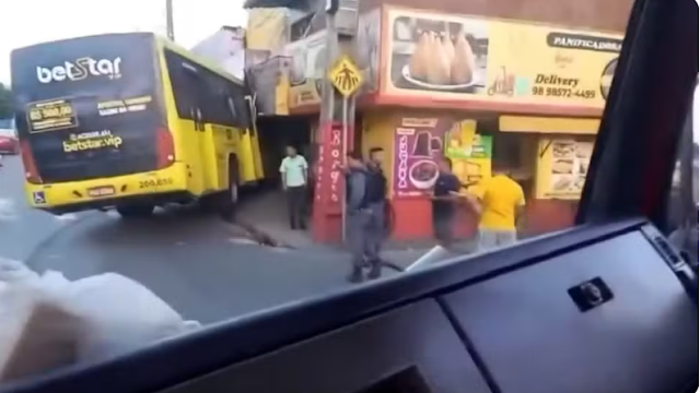 A foto acima é de um coletivo velho, que quebrou a barra de direção e invadiu estabelecimentos comerciais na Forquilha, destruindo parcialmente uma padaria, um restaurante e uma lanchonete.