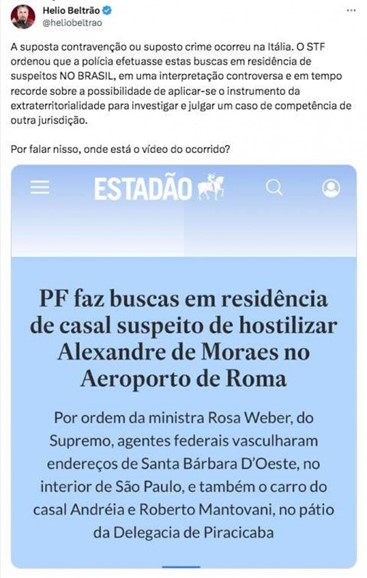 Com esse comentário nas redes sociais, o analista político e comentarista da CNN Brasil, Hélio Beltrão, foi uma das primeiras figuras públicas a questionar as motivações e a legalidade na ação de busca e apreensão na residência e até nos automóveis do empresário Roberto Mantovani Filho e de sua esposa Andréia Munarão. Ainda, um filho e o genro do casal, que também estavam no aeroporto, foram alvos da busca.
