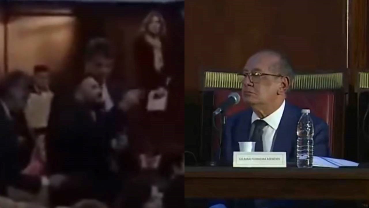 Symon Filipe de Castro Albino gritou que não há provas de que ele tenha entrado nos prédios destruídos em 2023 na Praça dos Três Poderes. O ministro do Supremo Tribunal Federal (STF), Gilmar Mendes, teve seu evento em Buenos Aires interrompido, nesta quinta-feira (7), por um protesto de um réu foragido da Justiça do Brasil que afirmou ter sido acusado sem provas, pelo ministro Alexandre de Moraes, de crimes pelos ataques do 8 de janeiro de 2023 aos Três Poderes da República. Symon Filipe de Castro Albino gritou da plateia que não há provas de que ele tenha entrado nos prédios que foram destruídos por apoiadores do ex-presidente Jair Bolsonaro (PL), no ataque motivado pela não aceitação da derrota do candidato à reeleição para o atual presidente Lula (PT), em 2022.
