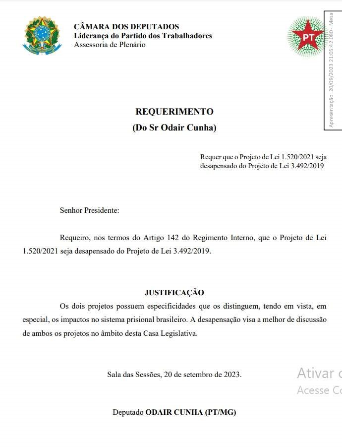 Um documento impetrado pelo partido, no sistema da Câmara dos Deputados, pede ‘desvinculação’ de uma outra proposta, assinada pelo deputado Odair Cunha (PT-MG), com tema semelhante, do escopo do projeto que teve êxito na CCJC, alcançando o plenário.