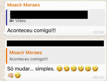 Apesar de Moacir ter usado o direito constitucional, de reclamar nas cortes por direito líquido e certo, a ação contra o Azeite parece ter despertado contra o idoso, em um minúsculo subgrupo do grupo de WhatsApp da Península, ira de tubarão, como na canção de Djavan. Outra ação há contra o Azeite, a do condomínio Monte Olimpo, tendo como objeto o uso irregular do estacionamento do prédio onde o Azeite funciona. Mas não se viu agressividade nenhuma contra seus autores. Moacir chegou a receber a sugestão de se mudar para outro local. Segundo penso, fica implícito aí o seguinte aviso: quem não gostar de poluição sonora não venha morar na Península. Dou abaixo o print da tela do WhatsApp onde se vê a grosseria.
