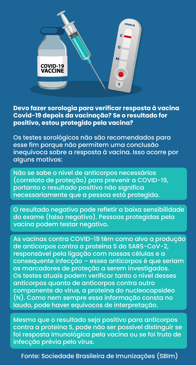 No entanto, não se sabe o nível de anticorpos necessários (correlato de proteção) para prevenir a Covid-19, portanto o resultado positivo não significa necessariamente que a pessoa está protegida. O resultado negativo também pode refletir a baixa sensibilidade do exame (falso negativo). Pessoas protegidas pela vacina podem testar negativo, segundo a Sociedade Brasileira e Imunologia (SBI).
