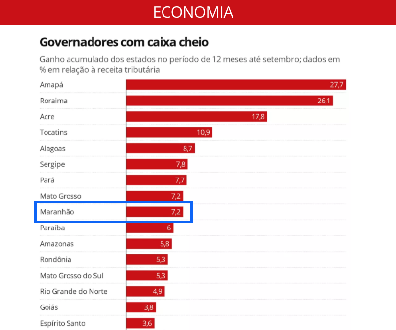 Segundo a publicação, um estudo elaborado pela Instituição Fiscal Independente (IFI) – órgão ligado ao Senado Federal – revela que apenas Ceará, Santa Catarina e São Paulo não registraram ganhos acumulados de receita no período de 12 meses até setembro.