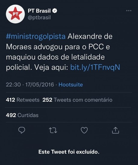 O PT usou a hashtag #ministrogolpista para dizer que “Alexandre de Moraes advogou para o PCC e maquiou dados de letalidade policial”.