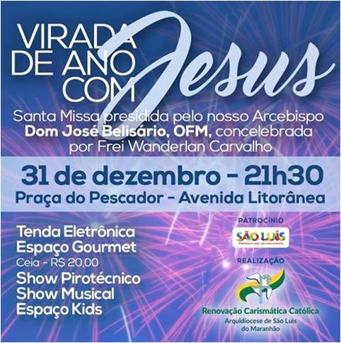 É com grande alegria que a Renovação Carismática Católica (RCC) da Arquidiocese de São Luís convida você para a grande festa da virada do ano no dia 31 de dezembro, a partir das 21h30, na Praça do Pescador, na Av. Litorânea.
