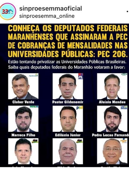 Sindicato mostra deputados maranhenses que assinaram a PEC 206 para mensalidades nas universidades públicas