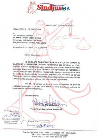 A direção do SINDJUS-MA solicitou nesta segunda-feira (2), no ofício nº 79/2016 audiência com o Governador Flávio Dino na busca de uma resposta formal do Governo para o pedido feito pelo Poder Judiciário. “Iremos até o governador Flávio Dino pedir que faça a suplementação porque não podemos mais sofrer com tantas perdas. A categoria está mobilizada quanto a essa pauta e já se propõe até acampar em frente ao Palácio dos Leões caso o governador não tome nenhuma medida”, declarou o vice-presidente do SINDJUS-MA, Márcio Luís.