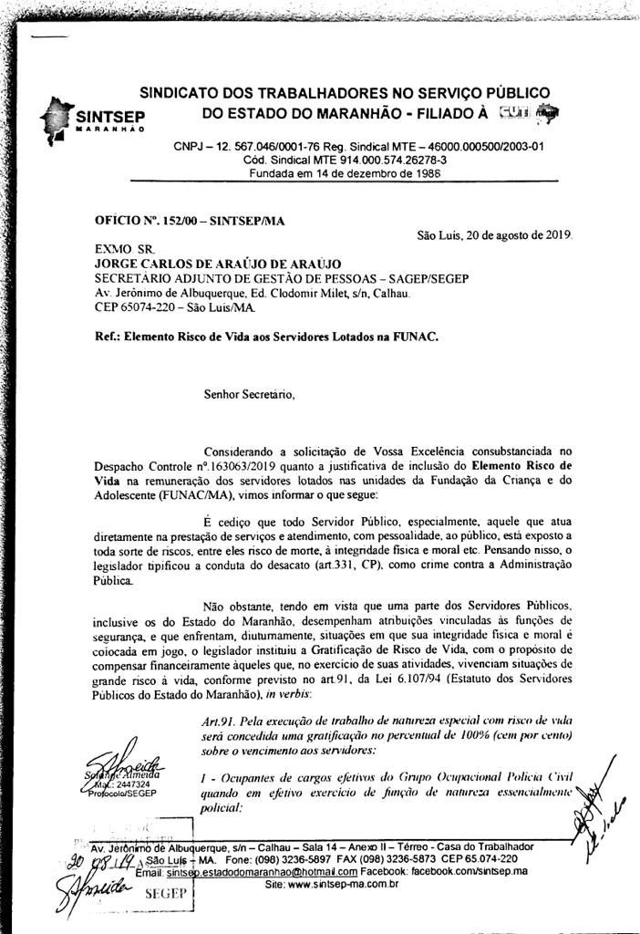 O SINTSEP, juntamente com Sindicato dos Servidores da Funac (SINDISFUNAC), protocolou, na Secretaria de Estado da Gestão, Patrimônio e Assistência dos Servidores (Segep), um ofício solicitando a garantia da inclusão do Adicional de Risco de Vida na remuneração dos servidores lotados nas unidades da Fundação da Criança e do Adolescente. No documento, o SINTSEP solicitou, ainda, reunião para tratar sobre o assunto. No início do mês, o SINTSEP já havia alertado para a tentativa do Governo do Estado de retirar o adicional, sob a justificativa de dificuldade financeira. Conforme previsto no art. 91, da Lei 6.107/94 (Estatuto dos Servidores Públicos do Estado do Maranhão), pela execução de trabalho de natureza especial com risco de vida será concedida uma gratificação no percentual de 100% sobre o vencimento. É o que ocorre com os delegados, vigias, funcionários da Casa de Albergado, servidores do sistema penitenciário e servidores lotados em estabelecimento penais, por exemplo.