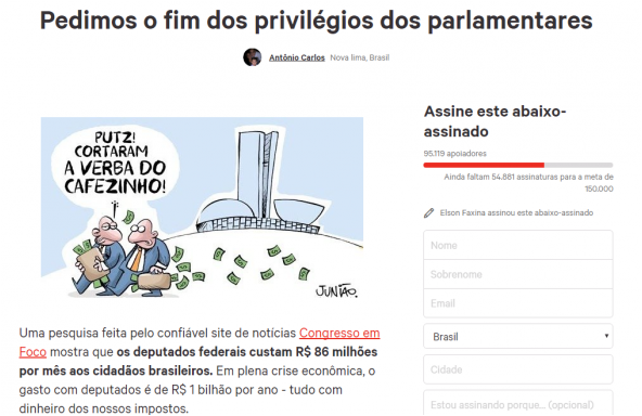 “Com R$ 1 bilhão por ano, seria possível construir hospitais e escolas pelo Brasil ao invés de gastar com os deputados”, diz o texto de uma campanha contra os privilégios dos deputados e senadores. “Tudo que pedimos é que deputados e senadores tenham um salário justo, condizente com o cargo que ocupam. Eles deveriam ter de contribuir com a Previdência por 35 anos e usar seus próprios carros, pagar sua própria gasolina, assim como qualquer cidadão”, conclui.